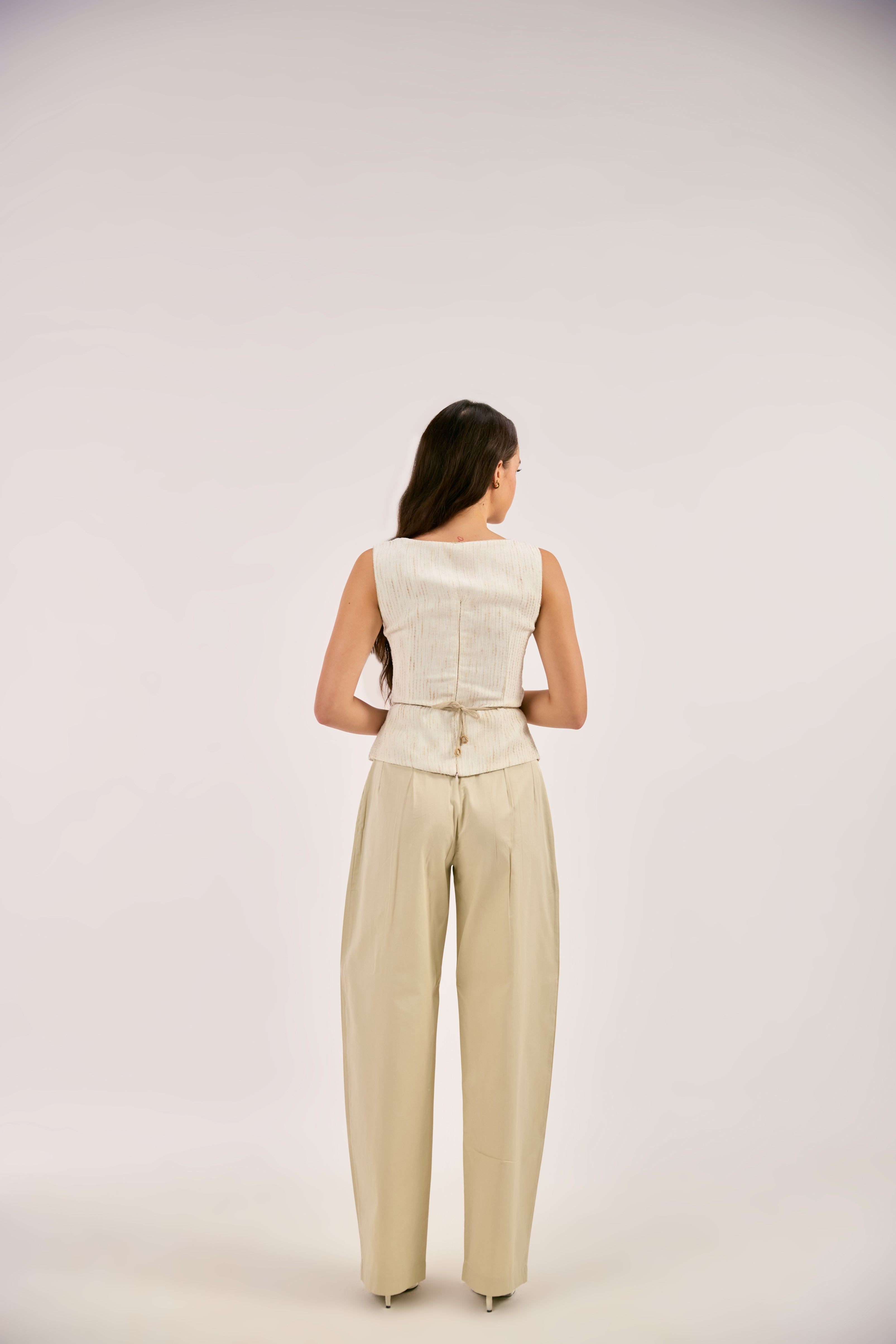 Together, the set pairs tactile surface detail with grounded, everyday structure.The sculpted linen top contrasts the relaxed volume of the bio cotton twill pant, creating balance in proportion.Designed to be worn as a complete expression or styled apart, the set moves effortlessly between form and function.
