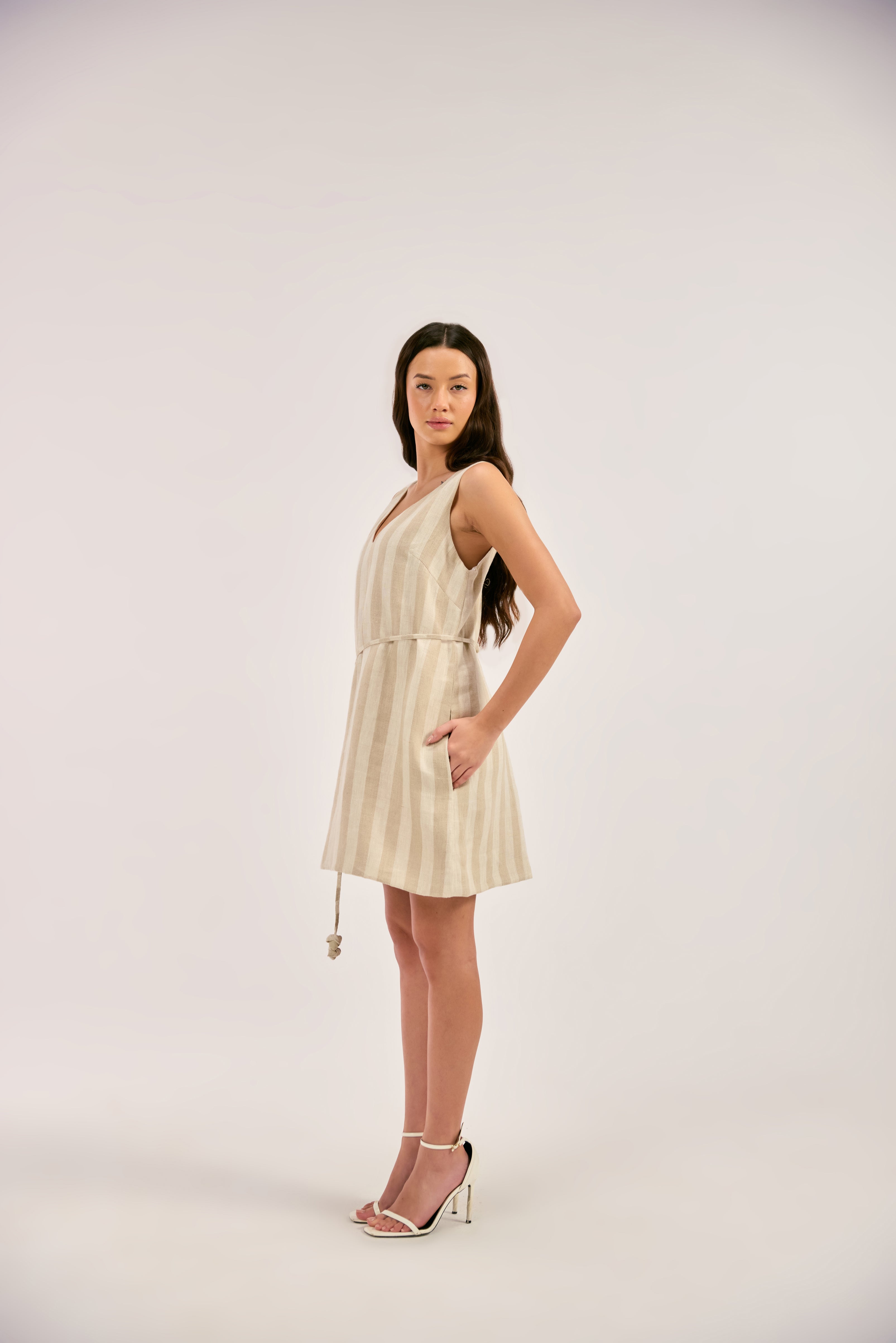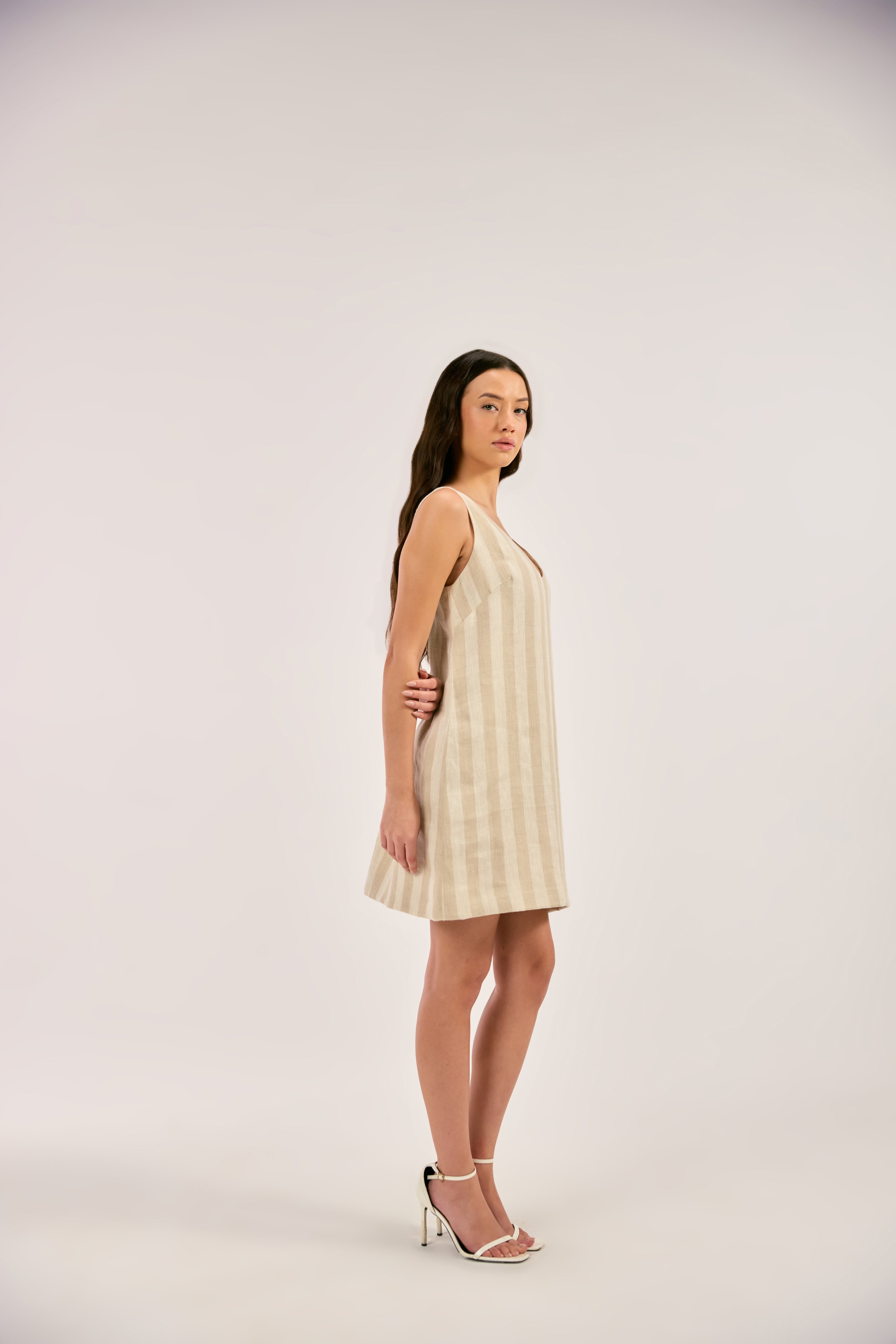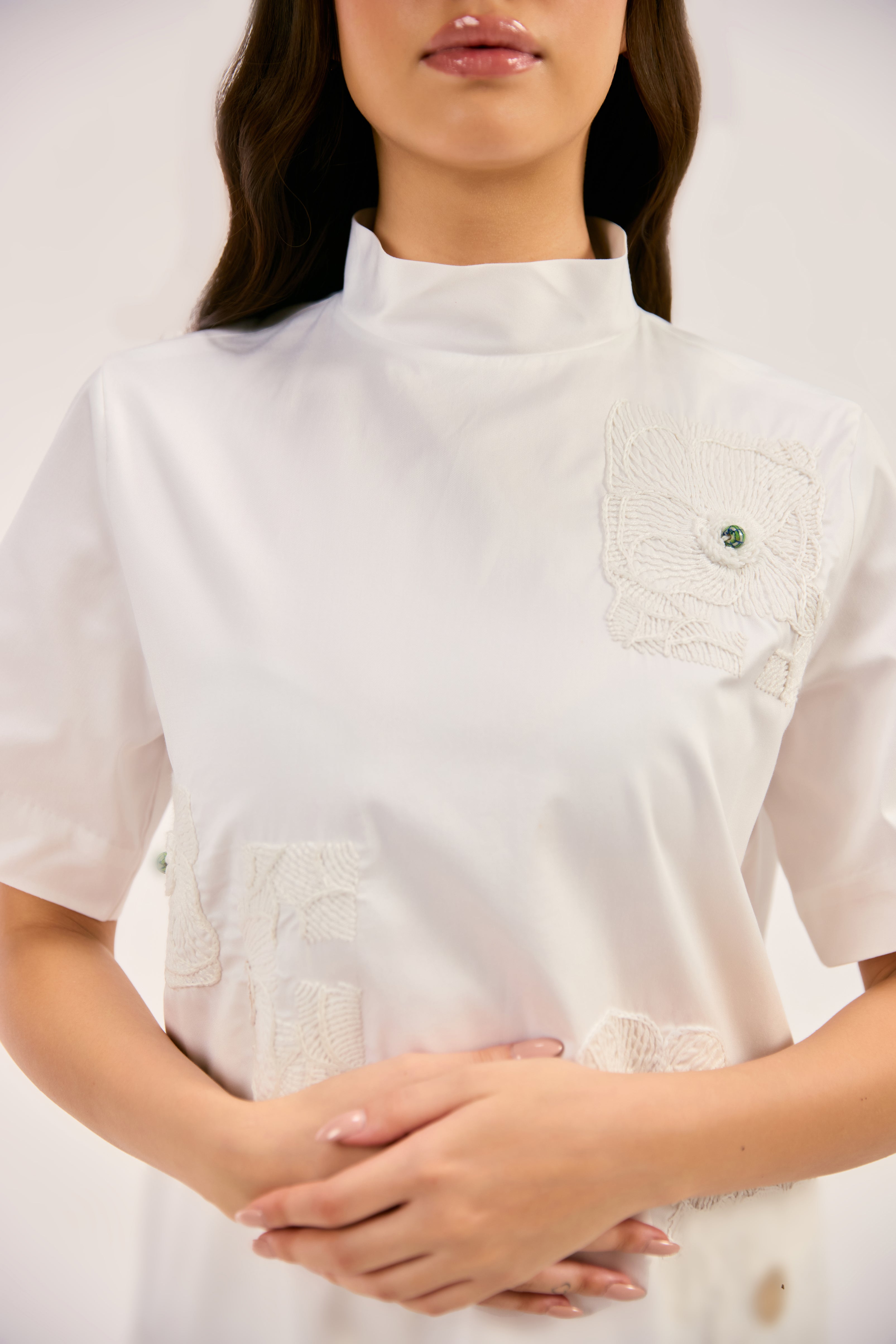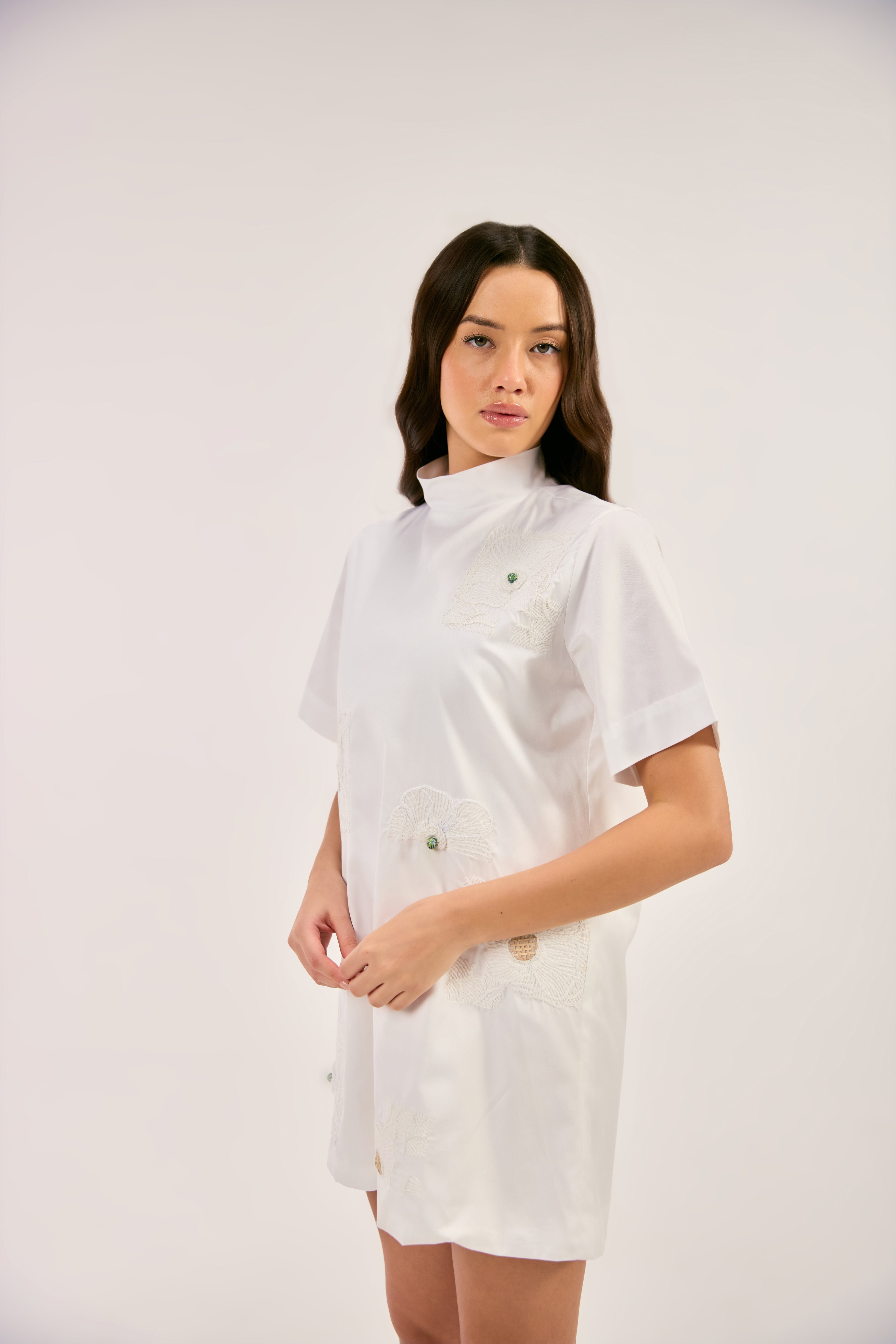 Made in fluid Tencel, this relaxed dress features a high neckline, short sleeves, and a clean back zip for ease and structure.Hand embroidery using real cane and blue pottery elements is carefully stitched with thread, adding tactile depth to an otherwise minimal form.