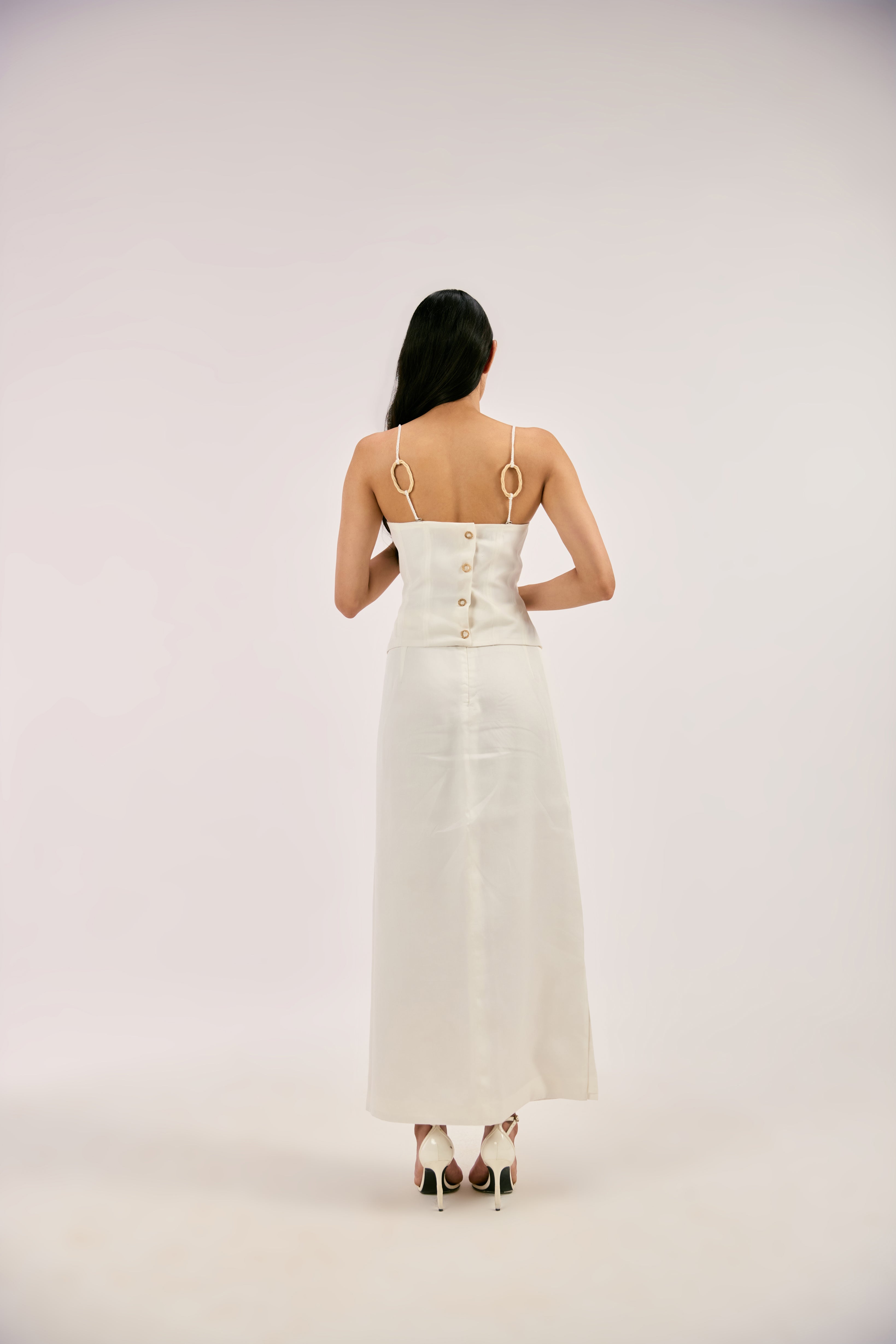 Threadhold is defined by its intentional craftsmanship. A full-length Tencel twill skirt, the skirt carries forward hand embroidery and real cane applique with a discreet side slit for movement. Designed to celebrate softness and structure—held together by thread and tradition.